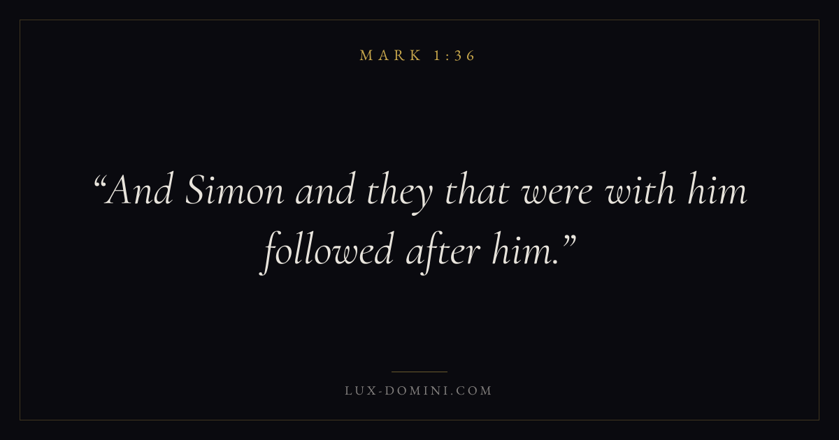 Books / Mark / Chapter 1 / Verse 36 ← Mark 1:35 Mark 1:36 Mark 1:37 → And Simon and they that were with him followed after him. Download verse card Share on Twitter Share on Facebook Pin it ✦ Key themes FaithSuffering and trialsDiscipleshipThe cross Read with Mark 1:33Mark 1:34Hebrews 11:1Romans 10:17 Related topics Bible verses about faithBible verses about suffering and trials ✦ Mark Chapter 1 verses V. 1 V. 2 V. 3 V. 4 V. 5 V. 6 V. 7 V. 8 V. 9 V. 10 V. 11 V. 12 V. 13 V. 14 V. 15 V. 16 V. 17 V. 18 V. 19 V. 20 V. 21 V. 22 V. 23 V. 24 V. 25 V. 26 V. 27 V. 28 V. 29 V. 30 V. 31 V. 32 V. 33 V. 34 V. 35 V. 36 V. 37 V. 38 V. 39 V. 40 V. 41 V. 42 V. 43 V. 44 V. 45