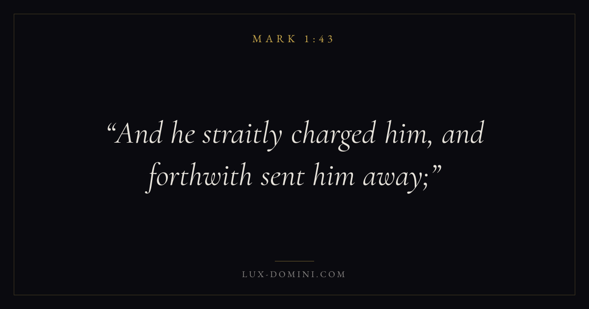Books / Mark / Chapter 1 / Verse 43 ← Mark 1:42 Mark 1:43 Mark 1:44 → And he straitly charged him, and forthwith sent him away; Download verse card Share on Twitter Share on Facebook Pin it ✦ Key themes FaithSuffering and trialsHumilityDiscipleship Read with Mark 1:44Mark 1:45Hebrews 11:1Romans 10:17 Related topics Bible verses about faithBible verses about suffering and trialsBible verses about humility ✦ Mark Chapter 1 verses V. 1 V. 2 V. 3 V. 4 V. 5 V. 6 V. 7 V. 8 V. 9 V. 10 V. 11 V. 12 V. 13 V. 14 V. 15 V. 16 V. 17 V. 18 V. 19 V. 20 V. 21 V. 22 V. 23 V. 24 V. 25 V. 26 V. 27 V. 28 V. 29 V. 30 V. 31 V. 32 V. 33 V. 34 V. 35 V. 36 V. 37 V. 38 V. 39 V. 40 V. 41 V. 42 V. 43 V. 44 V. 45