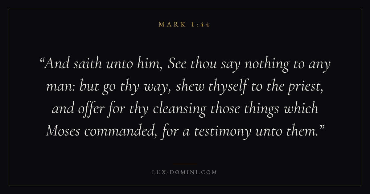 And saith unto him, See thou say nothing to any man: but go thy way, shew thyself to the priest, and offer for thy cleansing those things which Moses commanded, for a testimony unto them.