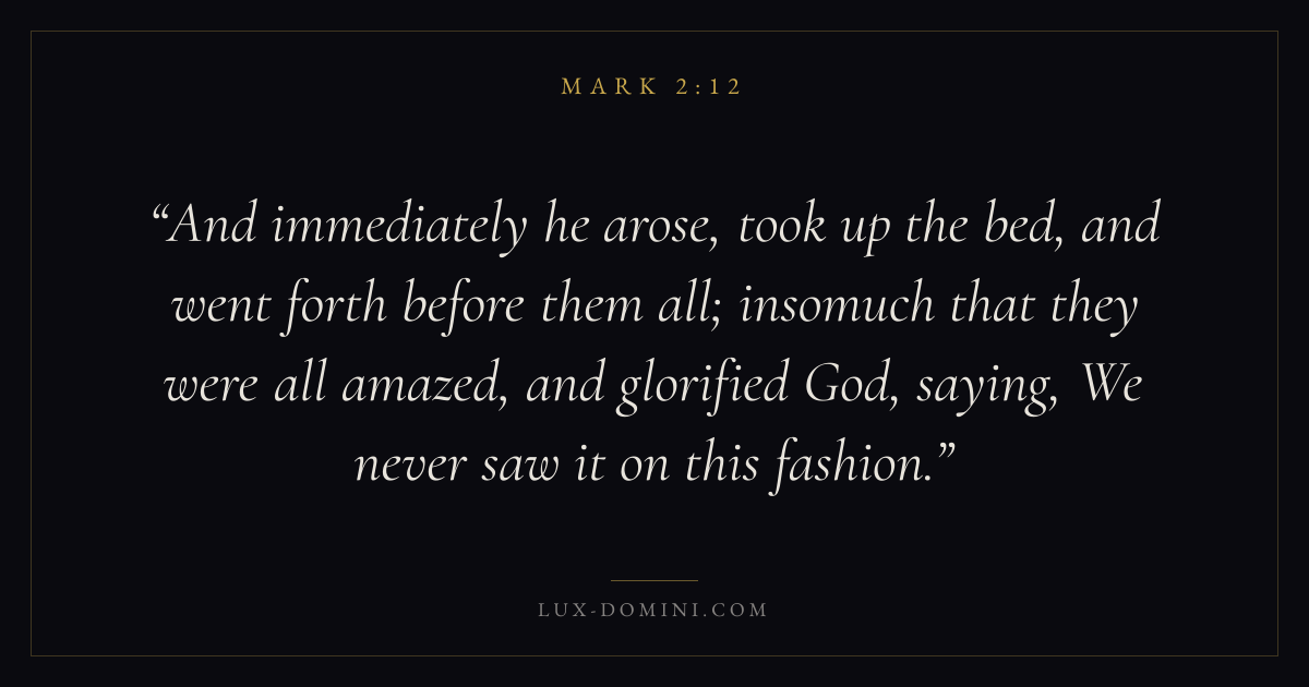 And immediately he arose, took up the bed, and went forth before them all; insomuch that they were all amazed, and glorified God, saying, We never saw it on this fashion.