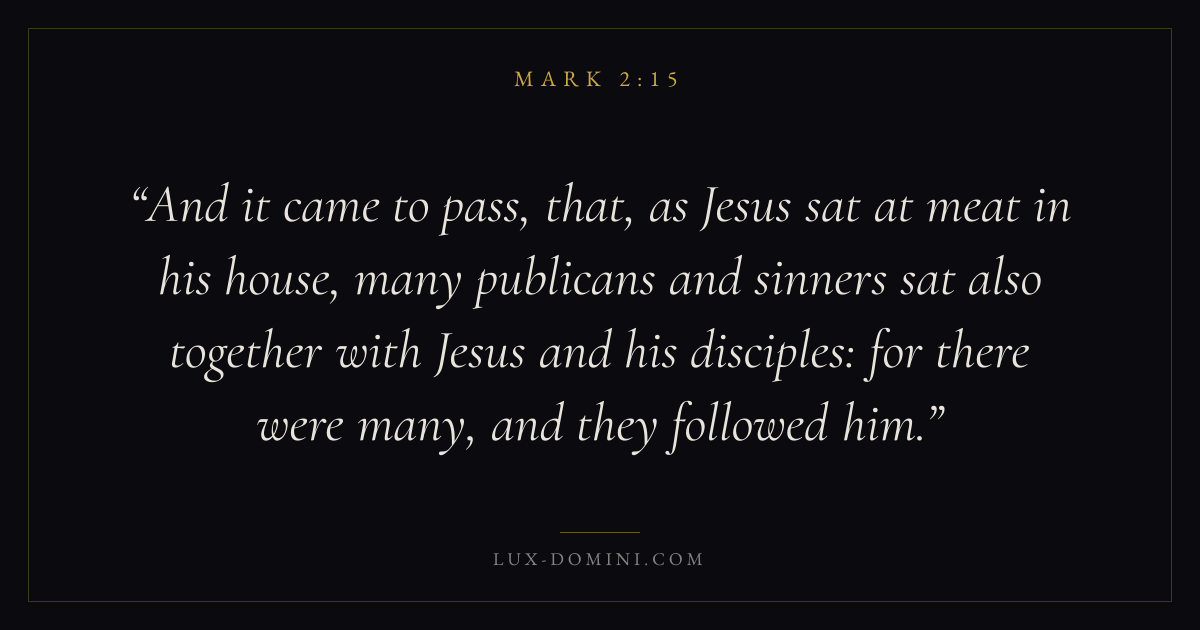 And it came to pass, that, as Jesus sat at meat in his house, many publicans and sinners sat also together with Jesus and his disciples: for there were many, and they followed him.