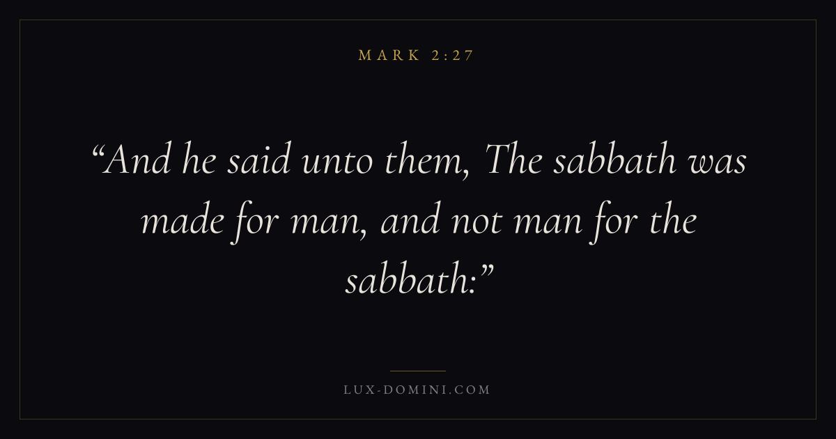 Books / Mark / Chapter 2 / Verse 27 ← Mark 2:26 Mark 2:27 Mark 2:28 → And he said unto them, The sabbath was made for man, and not man for the sabbath: Download verse card Share on Twitter Share on Facebook Pin it ✦ Key themes FaithSuffering and trialsDiscipleshipThe cross Read with Mark 2:26Mark 2:28Hebrews 11:1Romans 10:17 Related topics Bible verses about faithBible verses about suffering and trials ✦ Mark Chapter 2 verses V. 1 V. 2 V. 3 V. 4 V. 5 V. 6 V. 7 V. 8 V. 9 V. 10 V. 11 V. 12 V. 13 V. 14 V. 15 V. 16 V. 17 V. 18 V. 19 V. 20 V. 21 V. 22 V. 23 V. 24 V. 25 V. 26 V. 27 V. 28