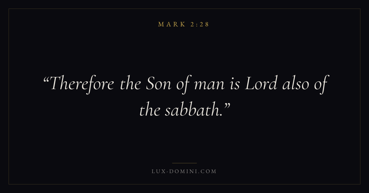 Books / Mark / Chapter 2 / Verse 28 ← Mark 2:27 Mark 2:28 Mark 3:1 → Therefore the Son of man is Lord also of the sabbath. Download verse card Share on Twitter Share on Facebook Pin it ✦ Key themes FaithSuffering and trialsDiscipleshipThe cross Read with Mark 2:26Mark 2:27Hebrews 11:1Romans 10:17 Related topics Bible verses about faithBible verses about suffering and trials ✦ Mark Chapter 2 verses V. 1 V. 2 V. 3 V. 4 V. 5 V. 6 V. 7 V. 8 V. 9 V. 10 V. 11 V. 12 V. 13 V. 14 V. 15 V. 16 V. 17 V. 18 V. 19 V. 20 V. 21 V. 22 V. 23 V. 24 V. 25 V. 26 V. 27 V. 28