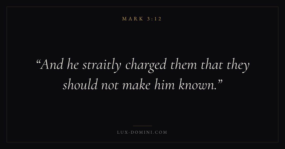 Books / Mark / Chapter 3 / Verse 12 ← Mark 3:11 Mark 3:12 Mark 3:13 → And he straitly charged them that they should not make him known. Download verse card Share on Twitter Share on Facebook Pin it ✦ Key themes FaithSuffering and trialsDiscipleshipThe cross Read with Mark 3:11Mark 3:13Hebrews 11:1Romans 10:17 Related topics Bible verses about faithBible verses about suffering and trials ✦ Mark Chapter 3 verses V. 1 V. 2 V. 3 V. 4 V. 5 V. 6 V. 7 V. 8 V. 9 V. 10 V. 11 V. 12 V. 13 V. 14 V. 15 V. 16 V. 17 V. 18 V. 19 V. 20 V. 21 V. 22 V. 23 V. 24 V. 25 V. 26 V. 27 V. 28 V. 29 V. 30 V. 31 V. 32 V. 33 V. 34 V. 35