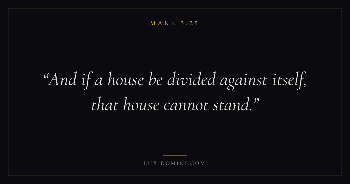 Books / Mark / Chapter 3 / Verse 25 ← Mark 3:24 Mark 3:25 Mark 3:26 → And if a house be divided against itself, that house cannot stand. Download verse card Share on Twitter Share on Facebook Pin it ✦ Key themes FaithSuffering and trialsDiscipleshipThe cross Read with Mark 3:22Mark 3:23Hebrews 11:1Romans 10:17 Related topics Bible verses about faithBible verses about suffering and trials ✦ Mark Chapter 3 verses V. 1 V. 2 V. 3 V. 4 V. 5 V. 6 V. 7 V. 8 V. 9 V. 10 V. 11 V. 12 V. 13 V. 14 V. 15 V. 16 V. 17 V. 18 V. 19 V. 20 V. 21 V. 22 V. 23 V. 24 V. 25 V. 26 V. 27 V. 28 V. 29 V. 30 V. 31 V. 32 V. 33 V. 34 V. 35