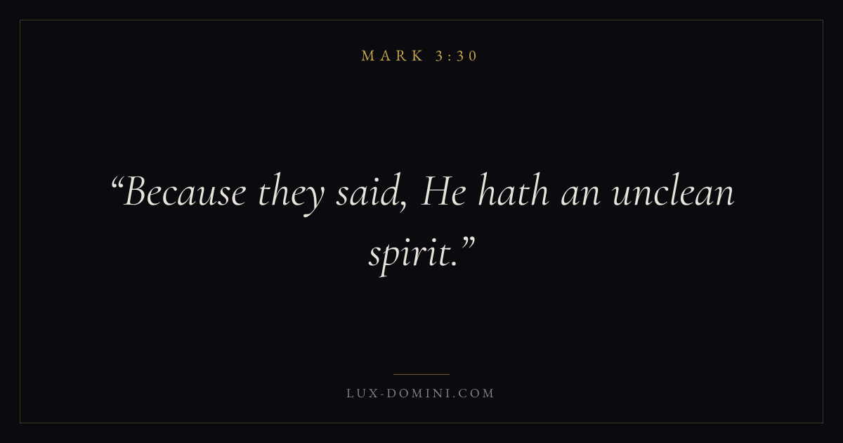 Books / Mark / Chapter 3 / Verse 30 ← Mark 3:29 Mark 3:30 Mark 3:31 → Because they said, He hath an unclean spirit. Download verse card Share on Twitter Share on Facebook Pin it ✦ Key themes FaithSuffering and trialsDiscipleshipThe cross Read with Mark 3:27Mark 3:28Hebrews 11:1Romans 10:17 Related topics Bible verses about faithBible verses about suffering and trials ✦ Mark Chapter 3 verses V. 1 V. 2 V. 3 V. 4 V. 5 V. 6 V. 7 V. 8 V. 9 V. 10 V. 11 V. 12 V. 13 V. 14 V. 15 V. 16 V. 17 V. 18 V. 19 V. 20 V. 21 V. 22 V. 23 V. 24 V. 25 V. 26 V. 27 V. 28 V. 29 V. 30 V. 31 V. 32 V. 33 V. 34 V. 35