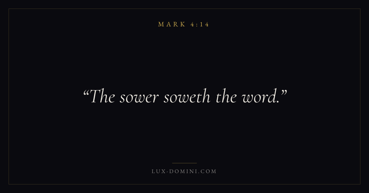 Books / Mark / Chapter 4 / Verse 14 ← Mark 4:13 Mark 4:14 Mark 4:15 → The sower soweth the word. Download verse card Share on Twitter Share on Facebook Pin it ✦ Key themes FaithSuffering and trialsTruthDiscipleship Read with Mark 4:15Mark 4:16Hebrews 11:1Romans 10:17 Related topics Bible verses about faithBible verses about suffering and trialsBible verses about truth ✦ Mark Chapter 4 verses V. 1 V. 2 V. 3 V. 4 V. 5 V. 6 V. 7 V. 8 V. 9 V. 10 V. 11 V. 12 V. 13 V. 14 V. 15 V. 16 V. 17 V. 18 V. 19 V. 20 V. 21 V. 22 V. 23 V. 24 V. 25 V. 26 V. 27 V. 28 V. 29 V. 30 V. 31 V. 32 V. 33 V. 34 V. 35 V. 36 V. 37 V. 38 V. 39 V. 40 V. 41