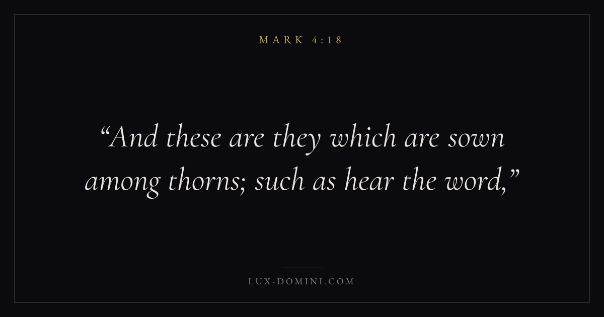 Books / Mark / Chapter 4 / Verse 18 ← Mark 4:17 Mark 4:18 Mark 4:19 → And these are they which are sown among thorns; such as hear the word, Download verse card Share on Twitter Share on Facebook Pin it ✦ Key themes FaithSuffering and trialsTruthDiscipleship Read with Mark 4:14Mark 4:15Hebrews 11:1Romans 10:17 Related topics Bible verses about faithBible verses about suffering and trialsBible verses about truth ✦ Mark Chapter 4 verses V. 1 V. 2 V. 3 V. 4 V. 5 V. 6 V. 7 V. 8 V. 9 V. 10 V. 11 V. 12 V. 13 V. 14 V. 15 V. 16 V. 17 V. 18 V. 19 V. 20 V. 21 V. 22 V. 23 V. 24 V. 25 V. 26 V. 27 V. 28 V. 29 V. 30 V. 31 V. 32 V. 33 V. 34 V. 35 V. 36 V. 37 V. 38 V. 39 V. 40 V. 41
