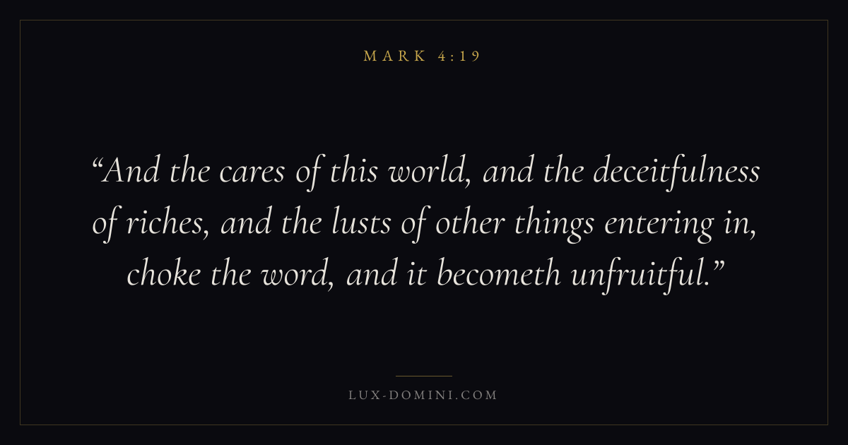 And the cares of this world, and the deceitfulness of riches, and the lusts of other things entering in, choke the word, and it becometh unfruitful.