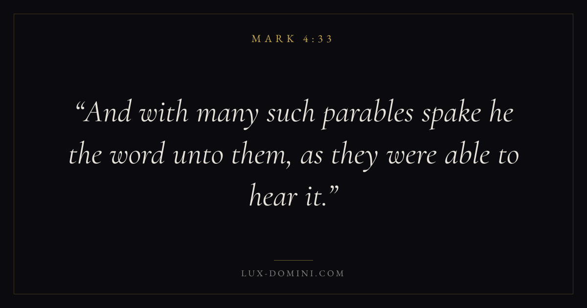 Books / Mark / Chapter 4 / Verse 33 ← Mark 4:32 Mark 4:33 Mark 4:34 → And with many such parables spake he the word unto them, as they were able to hear it. Download verse card Share on Twitter Share on Facebook Pin it ✦ Key themes FaithSuffering and trialsTruthDiscipleship Read with Mark 4:31Mark 4:32Hebrews 11:1Romans 10:17 Related topics Bible verses about faithBible verses about suffering and trialsBible verses about truth ✦ Mark Chapter 4 verses V. 1 V. 2 V. 3 V. 4 V. 5 V. 6 V. 7 V. 8 V. 9 V. 10 V. 11 V. 12 V. 13 V. 14 V. 15 V. 16 V. 17 V. 18 V. 19 V. 20 V. 21 V. 22 V. 23 V. 24 V. 25 V. 26 V. 27 V. 28 V. 29 V. 30 V. 31 V. 32 V. 33 V. 34 V. 35 V. 36 V. 37 V. 38 V. 39 V. 40 V. 41