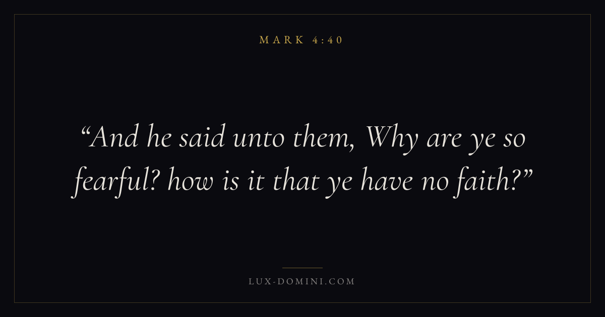 Books / Mark / Chapter 4 / Verse 40 ← Mark 4:39 Mark 4:40 Mark 4:41 → And he said unto them, Why are ye so fearful? how is it that ye have no faith? Download verse card Share on Twitter Share on Facebook Pin it ✦ Key themes FaithSuffering and trialsPrayerDiscipleship Read with Mark 4:36Mark 4:37Hebrews 11:1Romans 10:17 Related topics Bible verses about faithBible verses about suffering and trialsBible verses about prayer ✦ Mark Chapter 4 verses V. 1 V. 2 V. 3 V. 4 V. 5 V. 6 V. 7 V. 8 V. 9 V. 10 V. 11 V. 12 V. 13 V. 14 V. 15 V. 16 V. 17 V. 18 V. 19 V. 20 V. 21 V. 22 V. 23 V. 24 V. 25 V. 26 V. 27 V. 28 V. 29 V. 30 V. 31 V. 32 V. 33 V. 34 V. 35 V. 36 V. 37 V. 38 V. 39 V. 40 V. 41