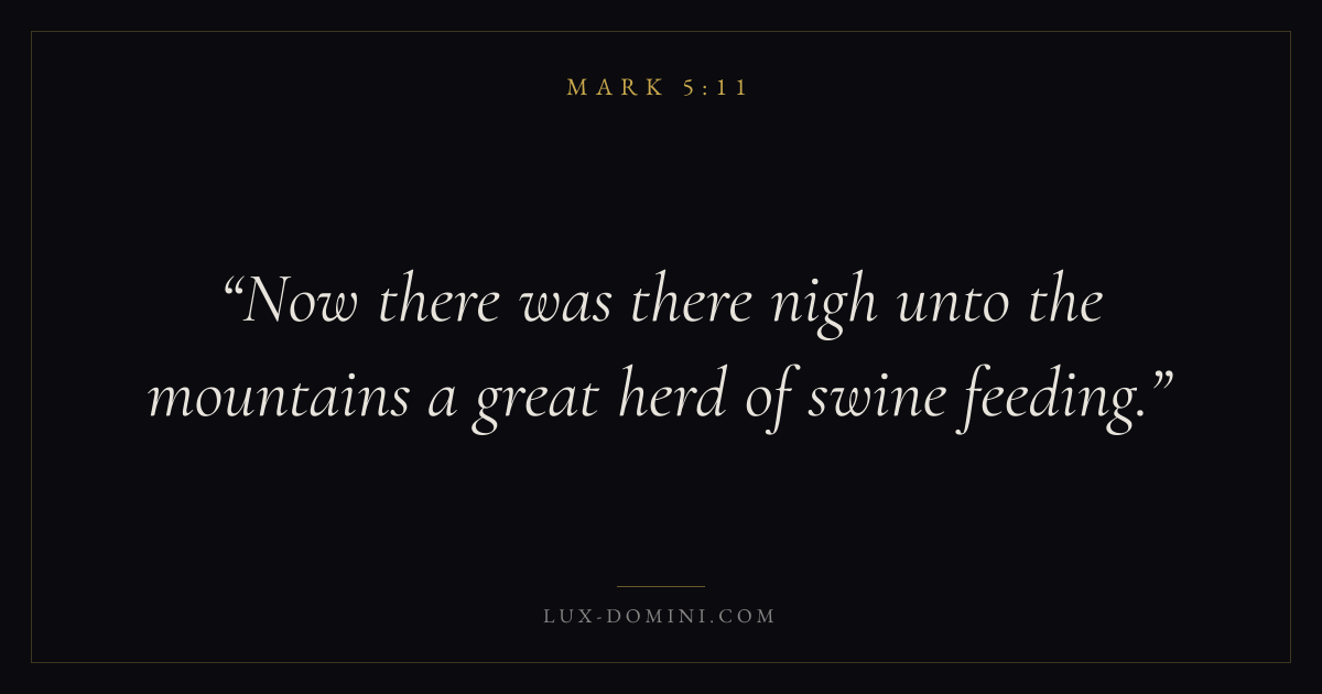 Books / Mark / Chapter 5 / Verse 11 ← Mark 5:10 Mark 5:11 Mark 5:12 → Now there was there nigh unto the mountains a great herd of swine feeding. Download verse card Share on Twitter Share on Facebook Pin it ✦ Key themes FaithSuffering and trialsDiscipleshipThe cross Read with Mark 5:12Mark 5:13Hebrews 11:1Romans 10:17 Related topics Bible verses about faithBible verses about suffering and trials ✦ Mark Chapter 5 verses V. 1 V. 2 V. 3 V. 4 V. 5 V. 6 V. 7 V. 8 V. 9 V. 10 V. 11 V. 12 V. 13 V. 14 V. 15 V. 16 V. 17 V. 18 V. 19 V. 20 V. 21 V. 22 V. 23 V. 24 V. 25 V. 26 V. 27 V. 28 V. 29 V. 30 V. 31 V. 32 V. 33 V. 34 V. 35 V. 36 V. 37 V. 38 V. 39 V. 40 V. 41 V. 42 V. 43