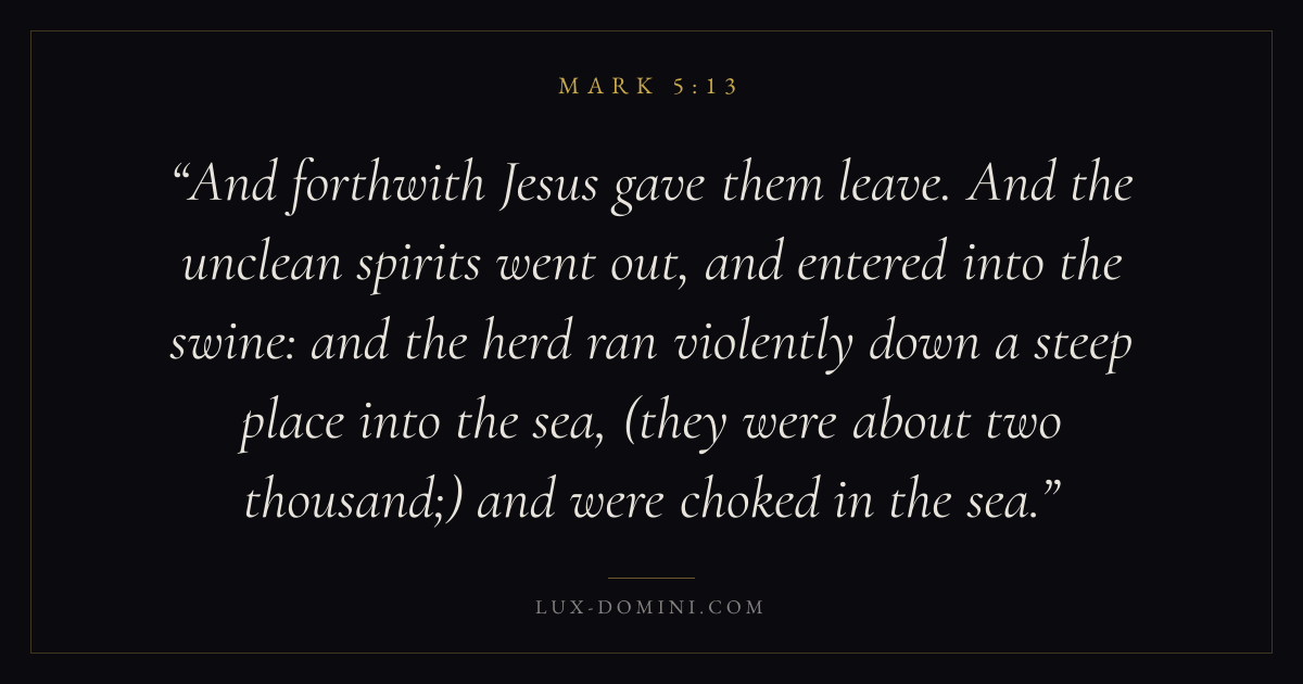 And forthwith Jesus gave them leave. And the unclean spirits went out, and entered into the swine: and the herd ran violently down a steep place into the sea, (they were about two thousand;) and were choked in the sea.