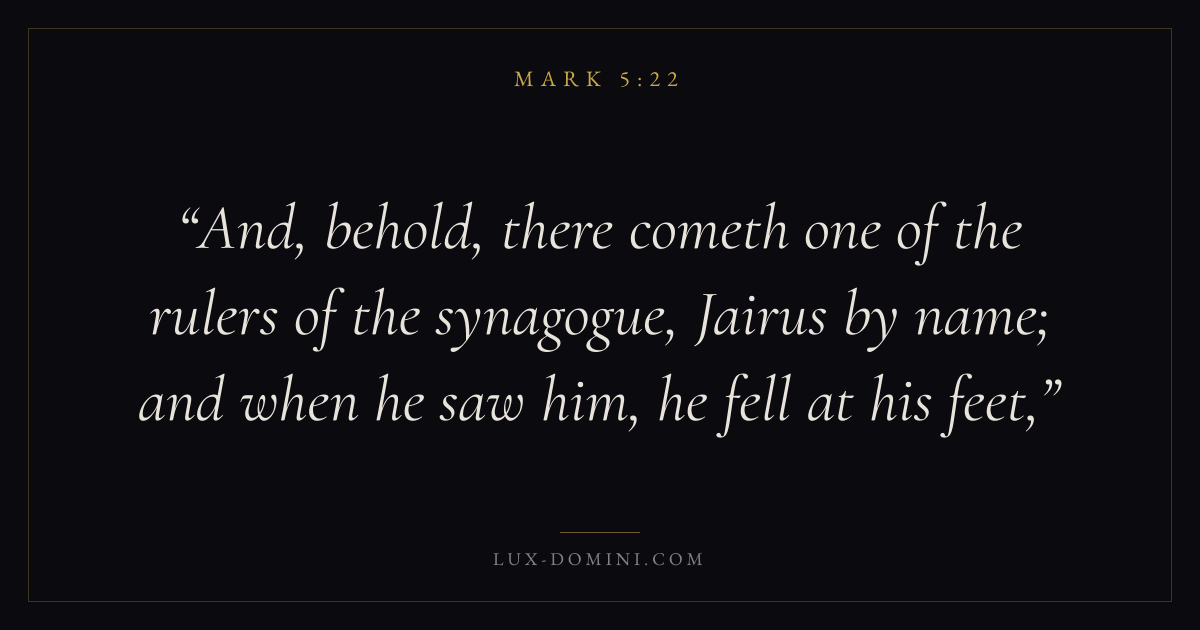 And, behold, there cometh one of the rulers of the synagogue, Jairus by name; and when he saw him, he fell at his feet,