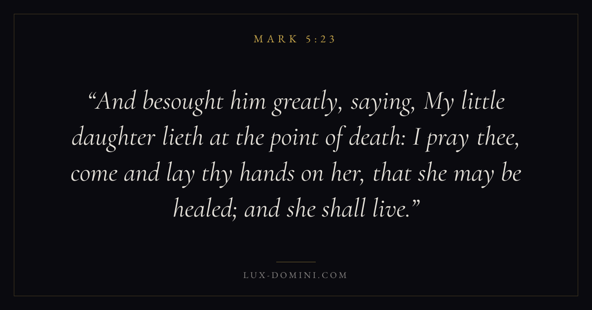 And besought him greatly, saying, My little daughter lieth at the point of death: I pray thee, come and lay thy hands on her, that she may be healed; and she shall live.