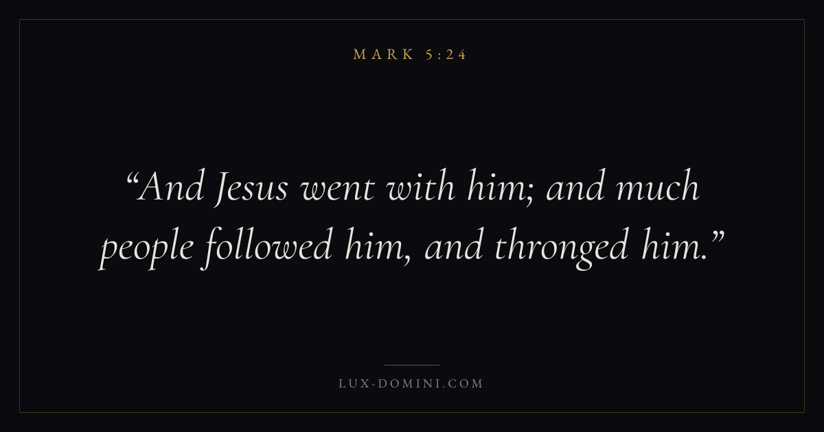 Books / Mark / Chapter 5 / Verse 24 ← Mark 5:23 Mark 5:24 Mark 5:25 → And Jesus went with him; and much people followed him, and thronged him. Download verse card Share on Twitter Share on Facebook Pin it ✦ Key themes FaithSuffering and trialsDiscipleshipThe cross Read with Mark 5:25Mark 5:26Hebrews 11:1Romans 10:17 Related topics Bible verses about faithBible verses about suffering and trials ✦ Mark Chapter 5 verses V. 1 V. 2 V. 3 V. 4 V. 5 V. 6 V. 7 V. 8 V. 9 V. 10 V. 11 V. 12 V. 13 V. 14 V. 15 V. 16 V. 17 V. 18 V. 19 V. 20 V. 21 V. 22 V. 23 V. 24 V. 25 V. 26 V. 27 V. 28 V. 29 V. 30 V. 31 V. 32 V. 33 V. 34 V. 35 V. 36 V. 37 V. 38 V. 39 V. 40 V. 41 V. 42 V. 43