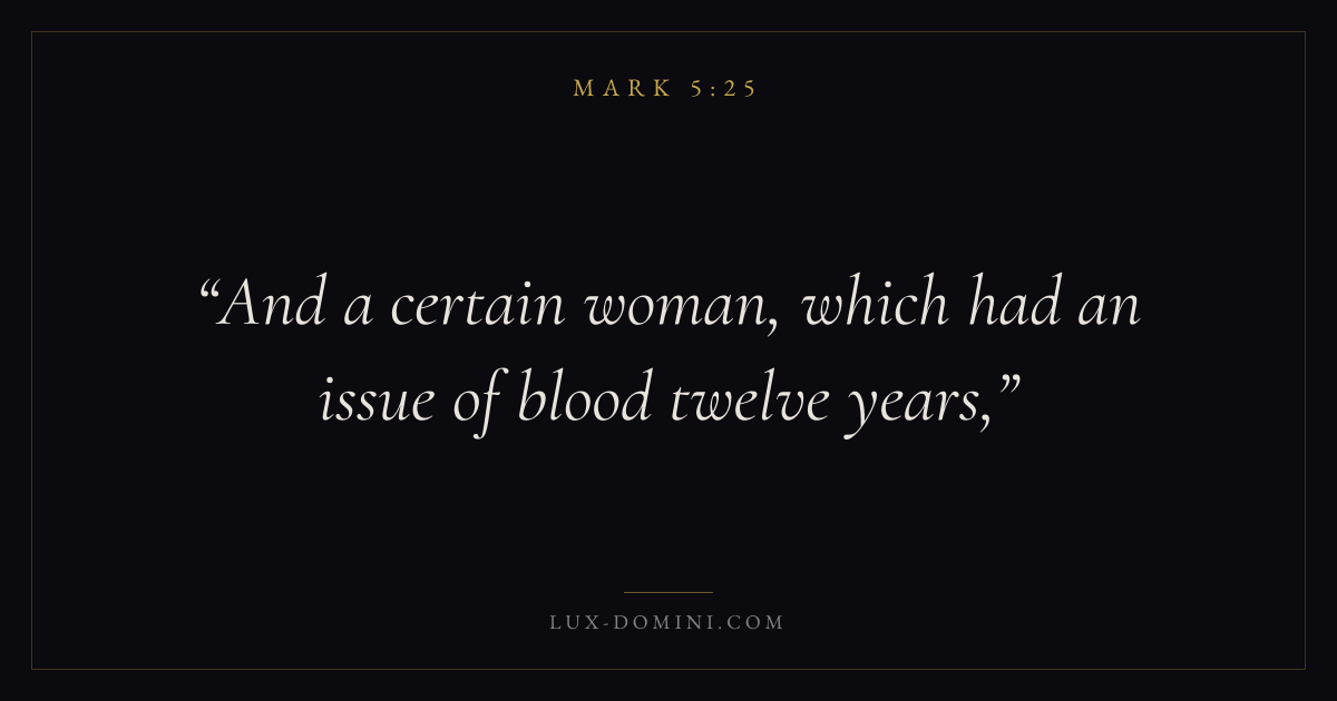Books / Mark / Chapter 5 / Verse 25 ← Mark 5:24 Mark 5:25 Mark 5:26 → And a certain woman, which had an issue of blood twelve years, Download verse card Share on Twitter Share on Facebook Pin it ✦ Key themes FaithSuffering and trialsDiscipleshipThe cross Read with Mark 5:24Mark 5:26Hebrews 11:1Romans 10:17 Related topics Bible verses about faithBible verses about suffering and trials ✦ Mark Chapter 5 verses V. 1 V. 2 V. 3 V. 4 V. 5 V. 6 V. 7 V. 8 V. 9 V. 10 V. 11 V. 12 V. 13 V. 14 V. 15 V. 16 V. 17 V. 18 V. 19 V. 20 V. 21 V. 22 V. 23 V. 24 V. 25 V. 26 V. 27 V. 28 V. 29 V. 30 V. 31 V. 32 V. 33 V. 34 V. 35 V. 36 V. 37 V. 38 V. 39 V. 40 V. 41 V. 42 V. 43