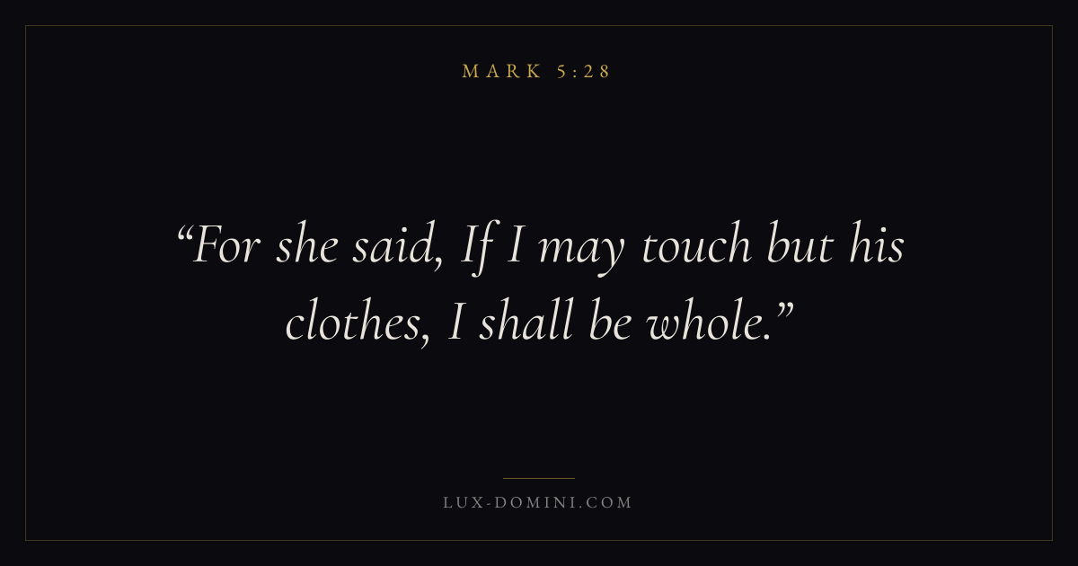 Books / Mark / Chapter 5 / Verse 28 ← Mark 5:27 Mark 5:28 Mark 5:29 → For she said, If I may touch but his clothes, I shall be whole. Download verse card Share on Twitter Share on Facebook Pin it ✦ Key themes FaithSuffering and trialsDiscipleshipThe cross Read with Mark 5:24Mark 5:25Hebrews 11:1Romans 10:17 Related topics Bible verses about faithBible verses about suffering and trials ✦ Mark Chapter 5 verses V. 1 V. 2 V. 3 V. 4 V. 5 V. 6 V. 7 V. 8 V. 9 V. 10 V. 11 V. 12 V. 13 V. 14 V. 15 V. 16 V. 17 V. 18 V. 19 V. 20 V. 21 V. 22 V. 23 V. 24 V. 25 V. 26 V. 27 V. 28 V. 29 V. 30 V. 31 V. 32 V. 33 V. 34 V. 35 V. 36 V. 37 V. 38 V. 39 V. 40 V. 41 V. 42 V. 43