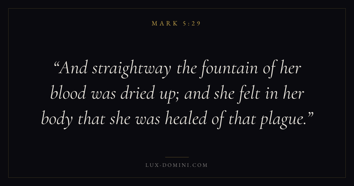 And straightway the fountain of her blood was dried up; and she felt in her body that she was healed of that plague.