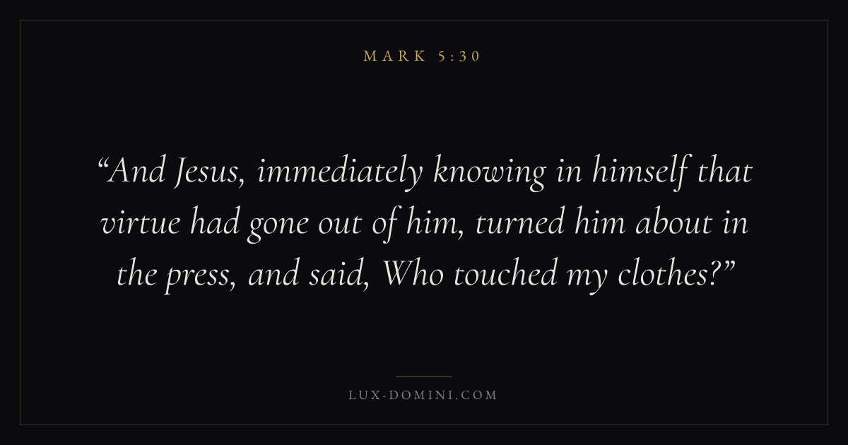 And Jesus, immediately knowing in himself that virtue had gone out of him, turned him about in the press, and said, Who touched my clothes?
