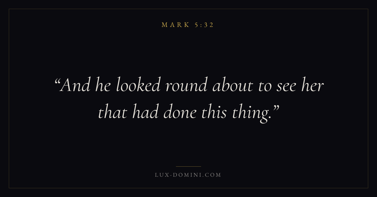 Books / Mark / Chapter 5 / Verse 32 ← Mark 5:31 Mark 5:32 Mark 5:33 → And he looked round about to see her that had done this thing. Download verse card Share on Twitter Share on Facebook Pin it ✦ Key themes FaithSuffering and trialsDiscipleshipThe cross Read with Mark 5:29Mark 5:30Hebrews 11:1Romans 10:17 Related topics Bible verses about faithBible verses about suffering and trials ✦ Mark Chapter 5 verses V. 1 V. 2 V. 3 V. 4 V. 5 V. 6 V. 7 V. 8 V. 9 V. 10 V. 11 V. 12 V. 13 V. 14 V. 15 V. 16 V. 17 V. 18 V. 19 V. 20 V. 21 V. 22 V. 23 V. 24 V. 25 V. 26 V. 27 V. 28 V. 29 V. 30 V. 31 V. 32 V. 33 V. 34 V. 35 V. 36 V. 37 V. 38 V. 39 V. 40 V. 41 V. 42 V. 43