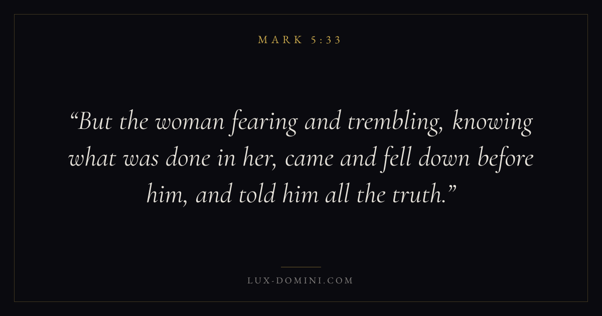 But the woman fearing and trembling, knowing what was done in her, came and fell down before him, and told him all the truth.