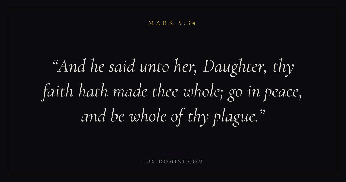 And he said unto her, Daughter, thy faith hath made thee whole; go in peace, and be whole of thy plague.