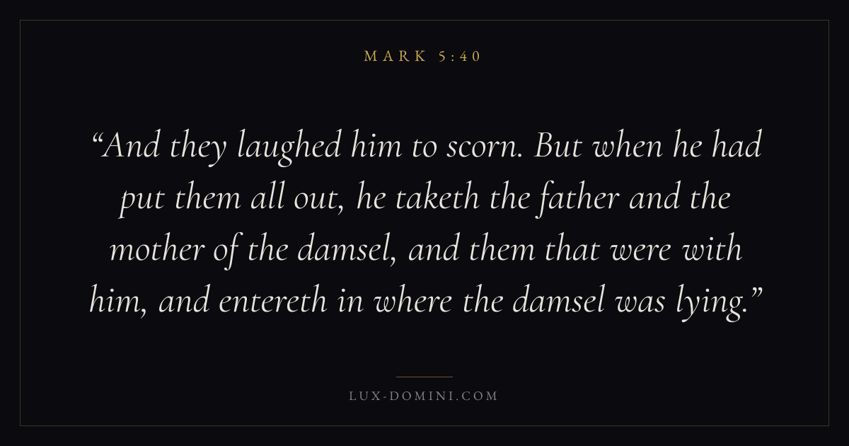 And they laughed him to scorn. But when he had put them all out, he taketh the father and the mother of the damsel, and them that were with him, and entereth in where the damsel was lying.