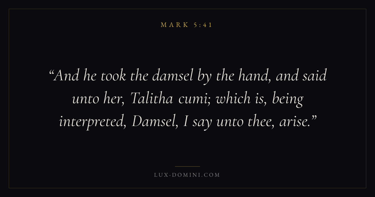 And he took the damsel by the hand, and said unto her, Talitha cumi; which is, being interpreted, Damsel, I say unto thee, arise.