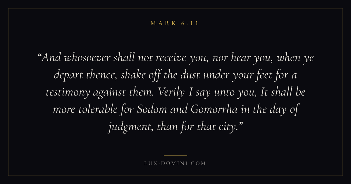 And whosoever shall not receive you, nor hear you, when ye depart thence, shake off the dust under your feet for a testimony against them. Verily I say unto you, It shall be more tolerable for Sodom and Gomorrha in the day of judgment, than for that city.