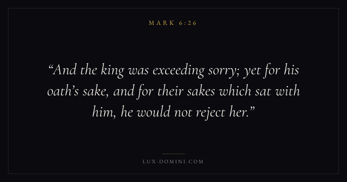 And the king was exceeding sorry; yet for his oath’s sake, and for their sakes which sat with him, he would not reject her.