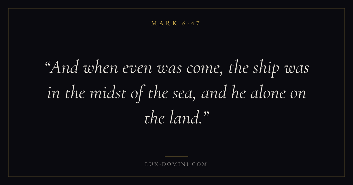 Books / Mark / Chapter 6 / Verse 47 ← Mark 6:46 Mark 6:47 Mark 6:48 → And when even was come, the ship was in the midst of the sea, and he alone on the land. Download verse card Share on Twitter Share on Facebook Pin it ✦ Key themes FaithSuffering and trialsDiscipleshipThe cross Read with Mark 6:43Mark 6:44Hebrews 11:1Romans 10:17 Related topics Bible verses about faithBible verses about suffering and trials ✦ Mark Chapter 6 verses V. 1 V. 2 V. 3 V. 4 V. 5 V. 6 V. 7 V. 8 V. 9 V. 10 V. 11 V. 12 V. 13 V. 14 V. 15 V. 16 V. 17 V. 18 V. 19 V. 20 V. 21 V. 22 V. 23 V. 24 V. 25 V. 26 V. 27 V. 28 V. 29 V. 30 V. 31 V. 32 V. 33 V. 34 V. 35 V. 36 V. 37 V. 38 V. 39 V. 40 V. 41 V. 42 V. 43 V. 44 V. 45 V. 46 V. 47 V. 48 V. 49 V. 50 V. 51 V. 52 V. 53 V. 54 V. 55 V. 56