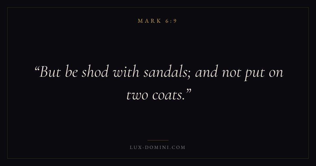 Books / Mark / Chapter 6 / Verse 9 ← Mark 6:8 Mark 6:9 Mark 6:10 → But be shod with sandals; and not put on two coats. Download verse card Share on Twitter Share on Facebook Pin it ✦ Key themes FaithSuffering and trialsDiscipleshipThe cross Read with Mark 6:7Mark 6:8Hebrews 11:1Romans 10:17 Related topics Bible verses about faithBible verses about suffering and trials ✦ Mark Chapter 6 verses V. 1 V. 2 V. 3 V. 4 V. 5 V. 6 V. 7 V. 8 V. 9 V. 10 V. 11 V. 12 V. 13 V. 14 V. 15 V. 16 V. 17 V. 18 V. 19 V. 20 V. 21 V. 22 V. 23 V. 24 V. 25 V. 26 V. 27 V. 28 V. 29 V. 30 V. 31 V. 32 V. 33 V. 34 V. 35 V. 36 V. 37 V. 38 V. 39 V. 40 V. 41 V. 42 V. 43 V. 44 V. 45 V. 46 V. 47 V. 48 V. 49 V. 50 V. 51 V. 52 V. 53 V. 54 V. 55 V. 56