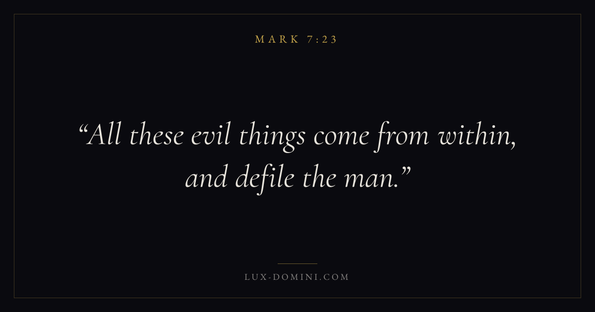 Books / Mark / Chapter 7 / Verse 23 ← Mark 7:22 Mark 7:23 Mark 7:24 → All these evil things come from within, and defile the man. Download verse card Share on Twitter Share on Facebook Pin it ✦ Key themes FaithSuffering and trialsDiscipleshipThe cross Read with Mark 7:21Mark 7:22Hebrews 11:1Romans 10:17 Related topics Bible verses about faithBible verses about suffering and trials ✦ Mark Chapter 7 verses V. 1 V. 2 V. 3 V. 4 V. 5 V. 6 V. 7 V. 8 V. 9 V. 10 V. 11 V. 12 V. 13 V. 14 V. 15 V. 16 V. 17 V. 18 V. 19 V. 20 V. 21 V. 22 V. 23 V. 24 V. 25 V. 26 V. 27 V. 28 V. 29 V. 30 V. 31 V. 32 V. 33 V. 34 V. 35 V. 36 V. 37