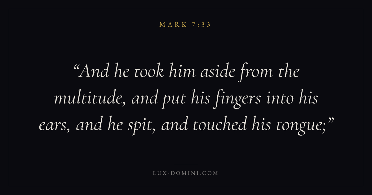 And he took him aside from the multitude, and put his fingers into his ears, and he spit, and touched his tongue;