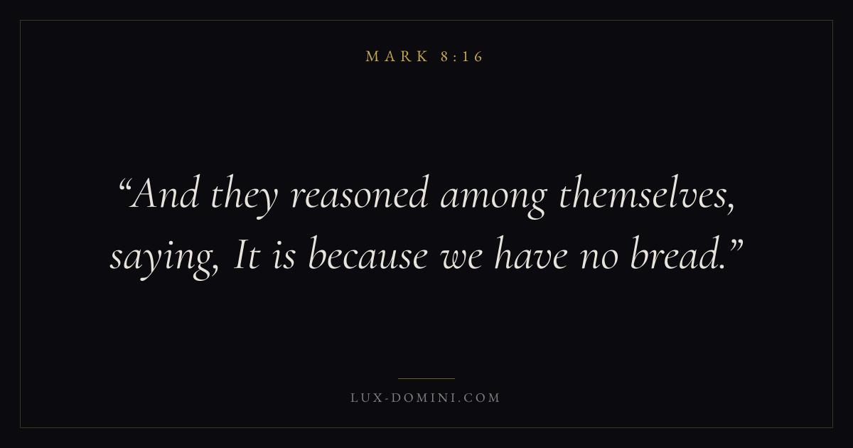 Books / Mark / Chapter 8 / Verse 16 ← Mark 8:15 Mark 8:16 Mark 8:17 → And they reasoned among themselves, saying, It is because we have no bread. Download verse card Share on Twitter Share on Facebook Pin it ✦ Key themes FaithSuffering and trialsDiscipleshipThe cross Read with Mark 8:14Mark 8:15Hebrews 11:1Romans 10:17 Related topics Bible verses about faithBible verses about suffering and trials ✦ Mark Chapter 8 verses V. 1 V. 2 V. 3 V. 4 V. 5 V. 6 V. 7 V. 8 V. 9 V. 10 V. 11 V. 12 V. 13 V. 14 V. 15 V. 16 V. 17 V. 18 V. 19 V. 20 V. 21 V. 22 V. 23 V. 24 V. 25 V. 26 V. 27 V. 28 V. 29 V. 30 V. 31 V. 32 V. 33 V. 34 V. 35 V. 36 V. 37 V. 38
