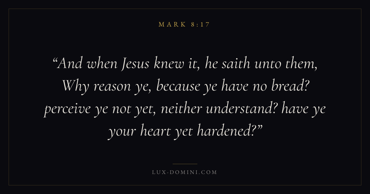 And when Jesus knew it, he saith unto them, Why reason ye, because ye have no bread? perceive ye not yet, neither understand? have ye your heart yet hardened?