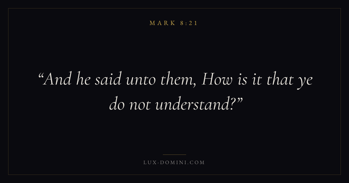 Books / Mark / Chapter 8 / Verse 21 ← Mark 8:20 Mark 8:21 Mark 8:22 → And he said unto them, How is it that ye do not understand? Download verse card Share on Twitter Share on Facebook Pin it ✦ Key themes FaithSuffering and trialsDiscipleshipThe cross Read with Mark 8:18Mark 8:19Hebrews 11:1Romans 10:17 Related topics Bible verses about faithBible verses about suffering and trials ✦ Mark Chapter 8 verses V. 1 V. 2 V. 3 V. 4 V. 5 V. 6 V. 7 V. 8 V. 9 V. 10 V. 11 V. 12 V. 13 V. 14 V. 15 V. 16 V. 17 V. 18 V. 19 V. 20 V. 21 V. 22 V. 23 V. 24 V. 25 V. 26 V. 27 V. 28 V. 29 V. 30 V. 31 V. 32 V. 33 V. 34 V. 35 V. 36 V. 37 V. 38