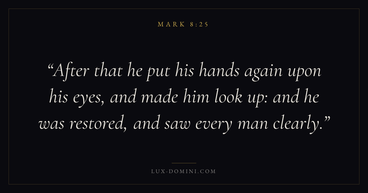 After that he put his hands again upon his eyes, and made him look up: and he was restored, and saw every man clearly.