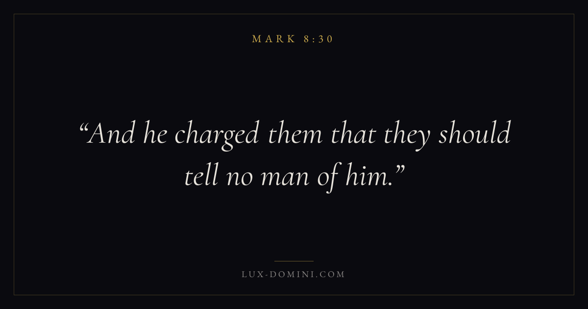 Books / Mark / Chapter 8 / Verse 30 ← Mark 8:29 Mark 8:30 Mark 8:31 → And he charged them that they should tell no man of him. Download verse card Share on Twitter Share on Facebook Pin it ✦ Key themes FaithSuffering and trialsDiscipleshipThe cross Read with Mark 8:27Mark 8:28Hebrews 11:1Romans 10:17 Related topics Bible verses about faithBible verses about suffering and trials ✦ Mark Chapter 8 verses V. 1 V. 2 V. 3 V. 4 V. 5 V. 6 V. 7 V. 8 V. 9 V. 10 V. 11 V. 12 V. 13 V. 14 V. 15 V. 16 V. 17 V. 18 V. 19 V. 20 V. 21 V. 22 V. 23 V. 24 V. 25 V. 26 V. 27 V. 28 V. 29 V. 30 V. 31 V. 32 V. 33 V. 34 V. 35 V. 36 V. 37 V. 38