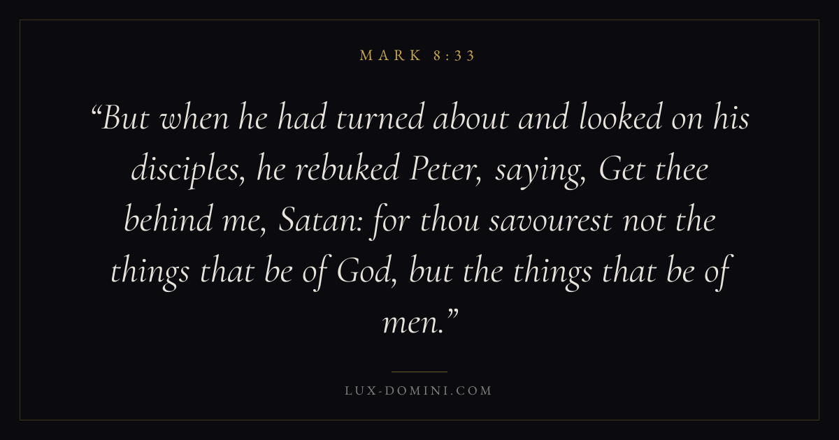 But when he had turned about and looked on his disciples, he rebuked Peter, saying, Get thee behind me, Satan: for thou savourest not the things that be of God, but the things that be of men.
