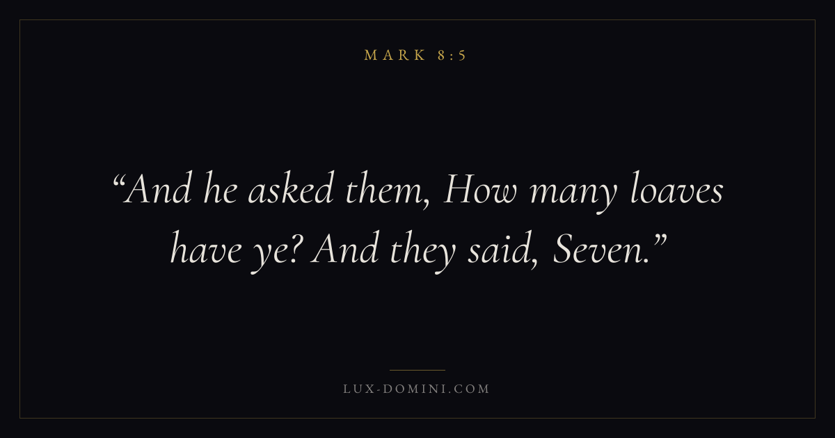 Books / Mark / Chapter 8 / Verse 5 ← Mark 8:4 Mark 8:5 Mark 8:6 → And he asked them, How many loaves have ye? And they said, Seven. Download verse card Share on Twitter Share on Facebook Pin it ✦ Key themes FaithSuffering and trialsPrayerGraceDiscipleship Read with Mark 8:1Mark 8:2Hebrews 11:1Romans 10:17 Related topics Bible verses about faithBible verses about suffering and trialsBible verses about prayerBible verses about grace ✦ Mark Chapter 8 verses V. 1 V. 2 V. 3 V. 4 V. 5 V. 6 V. 7 V. 8 V. 9 V. 10 V. 11 V. 12 V. 13 V. 14 V. 15 V. 16 V. 17 V. 18 V. 19 V. 20 V. 21 V. 22 V. 23 V. 24 V. 25 V. 26 V. 27 V. 28 V. 29 V. 30 V. 31 V. 32 V. 33 V. 34 V. 35 V. 36 V. 37 V. 38