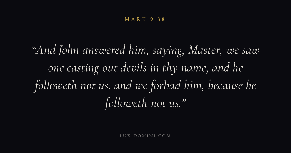 And John answered him, saying, Master, we saw one casting out devils in thy name, and he followeth not us: and we forbad him, because he followeth not us.