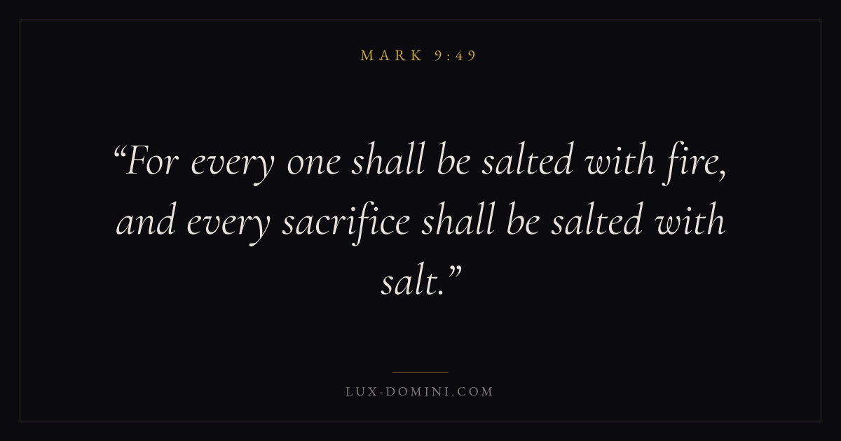 Books / Mark / Chapter 9 / Verse 49 ← Mark 9:48 Mark 9:49 Mark 9:50 → For every one shall be salted with fire, and every sacrifice shall be salted with salt. Download verse card Share on Twitter Share on Facebook Pin it ✦ Key themes FaithSuffering and trialsDiscipleshipThe cross Read with Mark 9:48Mark 9:50Hebrews 11:1Romans 10:17 Related topics Bible verses about faithBible verses about suffering and trials ✦ Mark Chapter 9 verses V. 1 V. 2 V. 3 V. 4 V. 5 V. 6 V. 7 V. 8 V. 9 V. 10 V. 11 V. 12 V. 13 V. 14 V. 15 V. 16 V. 17 V. 18 V. 19 V. 20 V. 21 V. 22 V. 23 V. 24 V. 25 V. 26 V. 27 V. 28 V. 29 V. 30 V. 31 V. 32 V. 33 V. 34 V. 35 V. 36 V. 37 V. 38 V. 39 V. 40 V. 41 V. 42 V. 43 V. 44 V. 45 V. 46 V. 47 V. 48 V. 49 V. 50