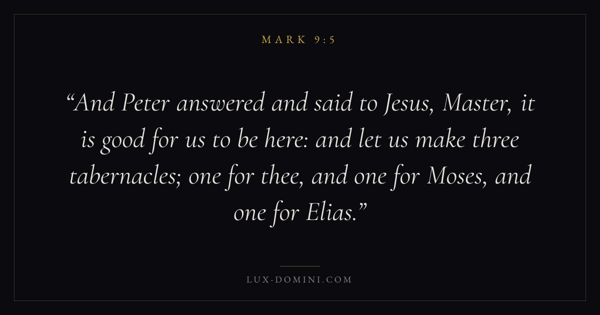 And Peter answered and said to Jesus, Master, it is good for us to be here: and let us make three tabernacles; one for thee, and one for Moses, and one for Elias.
