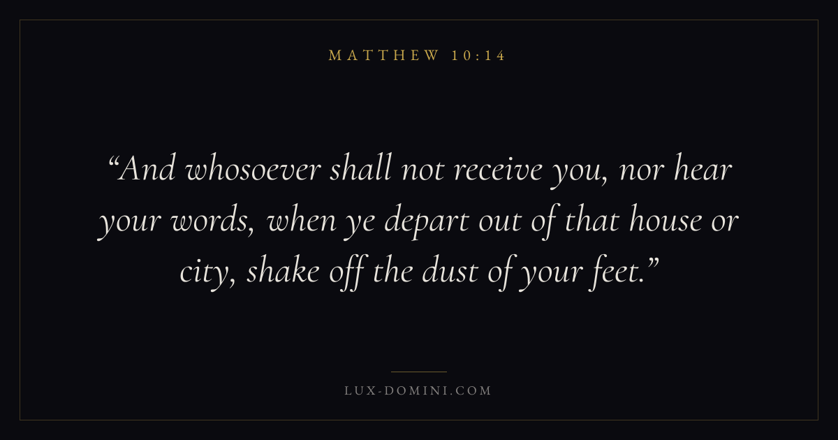 And whosoever shall not receive you, nor hear your words, when ye depart out of that house or city, shake off the dust of your feet.