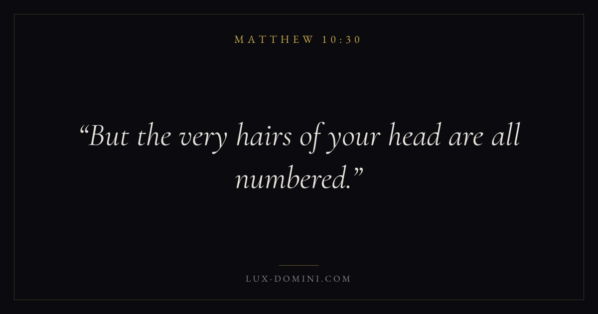 Books / Matthew / Chapter 10 / Verse 30 ← Matthew 10:29 Matthew 10:30 Matthew 10:31 → But the very hairs of your head are all numbered. Download verse card Share on Twitter Share on Facebook Pin it ✦ Key themes Eternal lifeFulfillmentKingdom of heavenDiscipleship Read with Matthew 10:29Matthew 10:31John 17:3John 11:25 Related topics Bible verses about eternal life ✦ Matthew Chapter 10 verses V. 1 V. 2 V. 3 V. 4 V. 5 V. 6 V. 7 V. 8 V. 9 V. 10 V. 11 V. 12 V. 13 V. 14 V. 15 V. 16 V. 17 V. 18 V. 19 V. 20 V. 21 V. 22 V. 23 V. 24 V. 25 V. 26 V. 27 V. 28 V. 29 V. 30 V. 31 V. 32 V. 33 V. 34 V. 35 V. 36 V. 37 V. 38 V. 39 V. 40 V. 41 V. 42