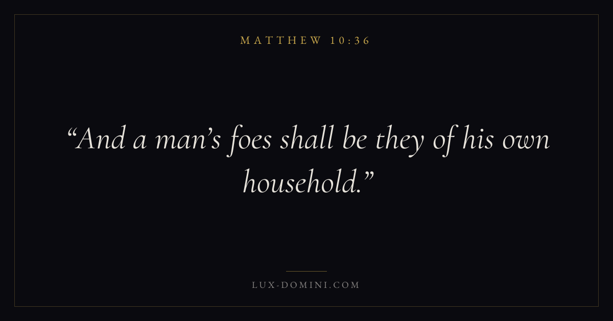 Books / Matthew / Chapter 10 / Verse 36 ← Matthew 10:35 Matthew 10:36 Matthew 10:37 → And a man’s foes shall be they of his own household. Download verse card Share on Twitter Share on Facebook Pin it ✦ Key themes LovePrayerWisdomJustice and mercyFulfillment Read with Matthew 10:34Matthew 10:35John 3:161 Corinthians 13:4 Related topics Bible verses about loveBible verses about prayerBible verses about wisdomBible verses about justice and mercy ✦ Matthew Chapter 10 verses V. 1 V. 2 V. 3 V. 4 V. 5 V. 6 V. 7 V. 8 V. 9 V. 10 V. 11 V. 12 V. 13 V. 14 V. 15 V. 16 V. 17 V. 18 V. 19 V. 20 V. 21 V. 22 V. 23 V. 24 V. 25 V. 26 V. 27 V. 28 V. 29 V. 30 V. 31 V. 32 V. 33 V. 34 V. 35 V. 36 V. 37 V. 38 V. 39 V. 40 V. 41 V. 42