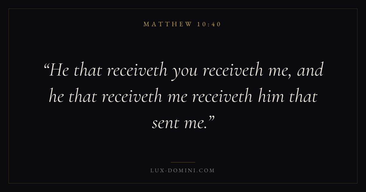 Books / Matthew / Chapter 10 / Verse 40 ← Matthew 10:39 Matthew 10:40 Matthew 10:41 → He that receiveth you receiveth me, and he that receiveth me receiveth him that sent me. Download verse card Share on Twitter Share on Facebook Pin it ✦ Key themes LovePrayerWisdomJustice and mercyFulfillment Read with Matthew 10:41Matthew 10:42John 3:161 Corinthians 13:4 Related topics Bible verses about loveBible verses about prayerBible verses about wisdomBible verses about justice and mercy ✦ Matthew Chapter 10 verses V. 1 V. 2 V. 3 V. 4 V. 5 V. 6 V. 7 V. 8 V. 9 V. 10 V. 11 V. 12 V. 13 V. 14 V. 15 V. 16 V. 17 V. 18 V. 19 V. 20 V. 21 V. 22 V. 23 V. 24 V. 25 V. 26 V. 27 V. 28 V. 29 V. 30 V. 31 V. 32 V. 33 V. 34 V. 35 V. 36 V. 37 V. 38 V. 39 V. 40 V. 41 V. 42