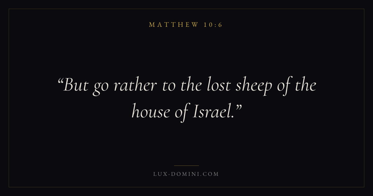 Books / Matthew / Chapter 10 / Verse 6 ← Matthew 10:5 Matthew 10:6 Matthew 10:7 → But go rather to the lost sheep of the house of Israel. Download verse card Share on Twitter Share on Facebook Pin it ✦ Key themes FulfillmentKingdom of heavenDiscipleshipTeaching Read with Matthew 10:5Matthew 10:7 ✦ Matthew Chapter 10 verses V. 1 V. 2 V. 3 V. 4 V. 5 V. 6 V. 7 V. 8 V. 9 V. 10 V. 11 V. 12 V. 13 V. 14 V. 15 V. 16 V. 17 V. 18 V. 19 V. 20 V. 21 V. 22 V. 23 V. 24 V. 25 V. 26 V. 27 V. 28 V. 29 V. 30 V. 31 V. 32 V. 33 V. 34 V. 35 V. 36 V. 37 V. 38 V. 39 V. 40 V. 41 V. 42